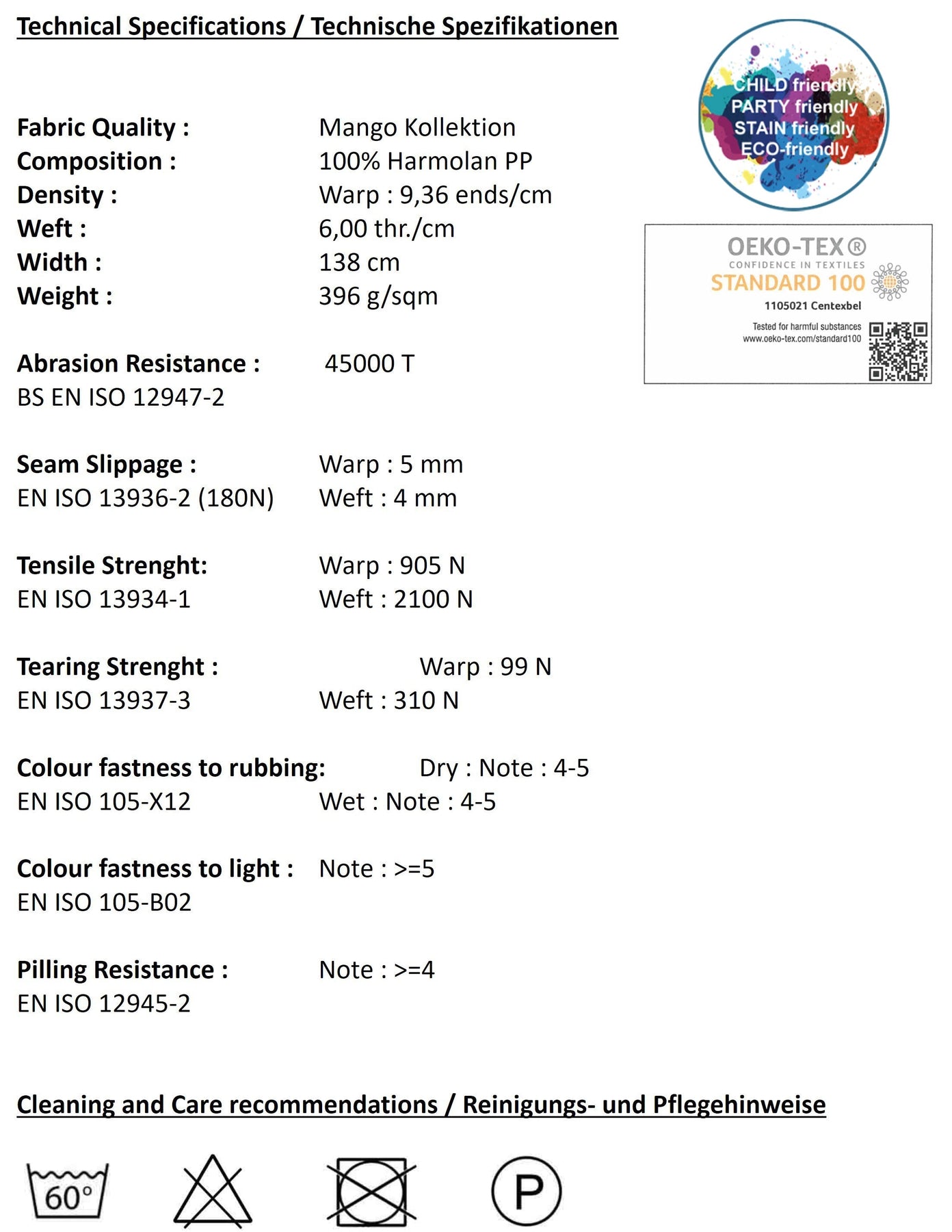 Mango ist ein Stoff mit bemerkenswerten Eigenschaften: Es handelt sich um einen leicht zu reinigenden Hochleistungsstoff, der aus Garnen hergestellt wird, die in einer unserer Anlagen weltweit extrudiert werden. Dieses Garn mit seiner speziellen Mischung ermöglicht es unvermeidliche Flecken einfach mit einem feuchten Tuch entfernen zu können.